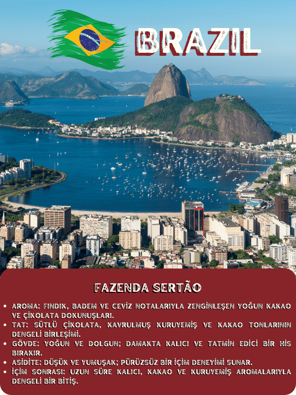 Brezilya Fazenda Sertão , karakteristik ve net bir tat profili arayan kahve severler için özel olarak sunulmuştur. Her yudumda doğal işleme yönteminin sunduğu zenginliği ve omniroast kavurmanın dengeli karakterini hissettiren bu kahve, sade içimde olduğu kadar sütlü reçetelerde de başarılı sonuçlar verir. Genel Profil: Yoğun gövdesi ve düşük asiditesiyle yumuşak ama tok bir içim sunan bu özel lot, özellikle dengeli ve aromatik kahveleri tercih edenler için idealdir. Ev tipi ve profesyonel kahve makinelerinde yüksek verim sağlarken, aynı zamanda V60, Chemex, French Press gibi elle demleme yöntemlerinde de karakteristik tatlarını net biçimde ortaya koyar. Aroma: Fındık, badem ve ceviz notalarıyla zenginleşen yoğun kakao ve çikolata dokunuşları. Tat: Sütlü çikolata, kavrulmuş kuruyemiş ve kakao tonlarının dengeli birleşimi. Gövde: Yoğun ve dolgun; damakta kalıcı ve tatmin edici bir his bırakır. Asidite: Düşük ve yumuşak; pürüzsüz bir içim deneyimi sunar. İçim Sonrası: Uzun süre kalıcı, kakao ve kuruyemiş aromalarıyla dengeli bir bitiş.