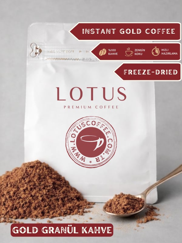 Genel Profil: Freeze-dry (dondurarak kurutma) yöntemi ile üretilmiş Gold Instant kahvemiz, granül kahvede nitelik arayanlar için özel olarak geliştirilmiştir. Bu ileri teknoloji sayesinde kahvenin doğal aroması ve uçucu bileşenleri maksimum seviyede korunur. Klasik (spray-dry) granül kahvelere kıyasla daha iri kristal yapıya sahip olan Gold serisi, daha yoğun aroma, daha berrak tat ve daha premium bir içim sunar. Özenle seçilmiş %100 Arabica çekirdekler, ideal kavurma profiliyle işlenip düşük ısıda dondurularak kurutulur. Böylece hem pratiklik hem de nitelikli kahve deneyimi aynı fincanda buluşur. Lotus Coffee Gold Instant — pratikliğin en rafine hali. Aroma: Zengin çikolata, karamel notaları Tat: Dengeli, pürüzsüz ve rafine tat profili Gövde: Orta-üst dolgunlukta, ipeksi yapı Asidite: Düşük-orta, dengeli ve zarif İçim Sonrası: Temiz, uzun ve yumuşak bitiş İçerik: %100 Arabica freeze-dry (gold instant) kahve Üretim Yöntemi: Dondurarak kurutma (freeze-dried coffee) Hazırlama Önerisi: 2 çay kaşığı (≈2-4 g) kahveye 180 ml sıcak su ekleyin, karıştırın. İsteğe göre süt veya şeker ilave edebilirsiniz. Pratikliğin yanında nitelikli kahve deneyimi arayanlara Yoğun aromalı, yumuşak içimli premium granül kahve tercih edenlere Evde, ofiste veya seyahatte hızlı ama kaliteli kahve isteyenlere Klasik granül kahveden daha rafine bir alternatif arayanlara