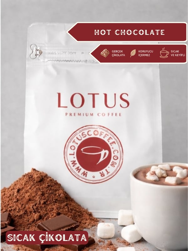 Genel Profil: Lotus Premium Coffee’den içinizi ısıtacak bir klasik: Zengin kakao aromalı toz sıcak çikolata! Yoğun lezzeti ve kadifemsi dokusuyla hem çocukların hem de yetişkinlerin favorisi olmaya aday. Soğuk kış günlerinde sıcak bir fincanla, yaz aylarında buzlu sunumlarla günün her anına eşlik eder. Aroma: Yoğun kakao, hafif vanilya dokunuşları Tat: Dengeli bir tatlılık, kremsi ve doyurucu bir çikolata tadı Doku: Orta yoğunlukta, kadifemsi içim İçim Sonrası: Ağızda uzun süre kalan yumuşak ve tatlı bir bitiş İçerik: Şeker, kakao tozu (%20), süt tozu, mısır nişastası, doğal aroma vericiler Ambalaj: Özel kilitli kraft torba ile uzun süre tazelik koruması Ağırlık: 500 g Hazırlama Önerisi: 200 ml sıcak süt veya suya 2 yemek kaşığı (≈25 g) toz sıcak çikolata ekleyin. Karıştırarak homojen hale getirin. İsteğe bağlı olarak üzerine krema veya marshmallow ile servis edebilirsiniz. Klasik sıcak çikolata lezzetini evinde arayanlara Kafelerdeki sıcak çikolata kalitesini evde arayan tat düşkünlerine