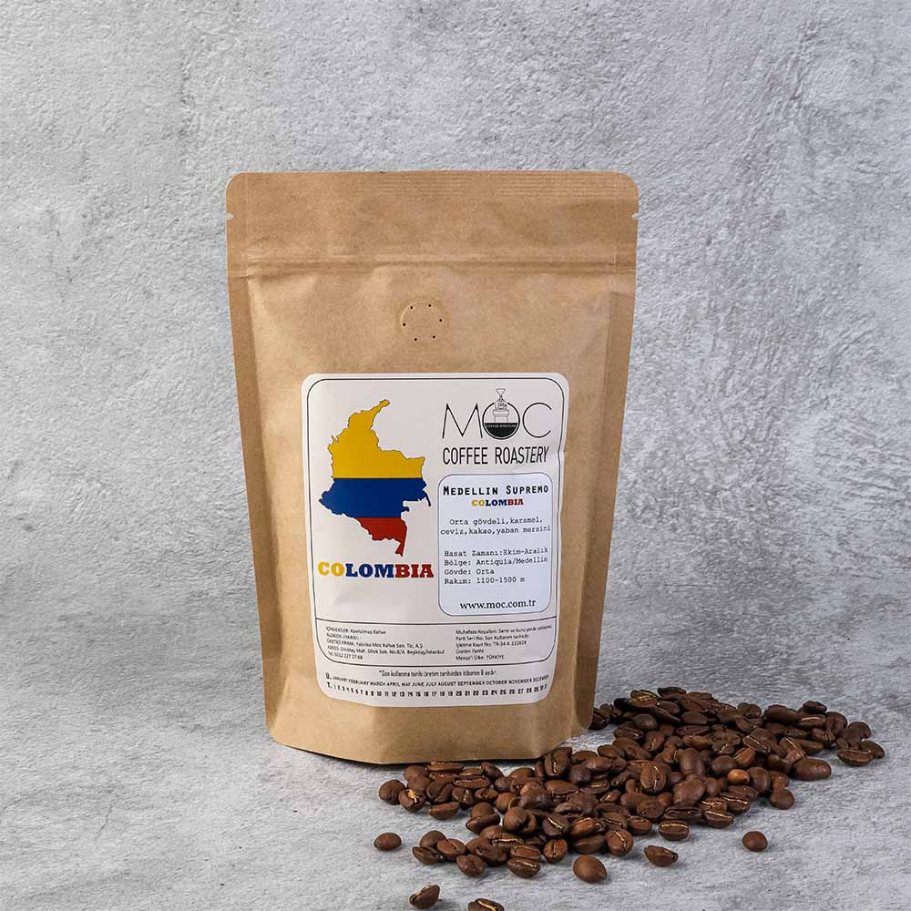 MEDELLIN SUPREMO COLOMBIA Aroma:Karamel ,Ceviz, Kakao, Yaban Mersini Hasat Zamanı :Ekim-Aralık Bölge:Antioquia Gövde :Orta gövdeli Rakım:1100-1500 m