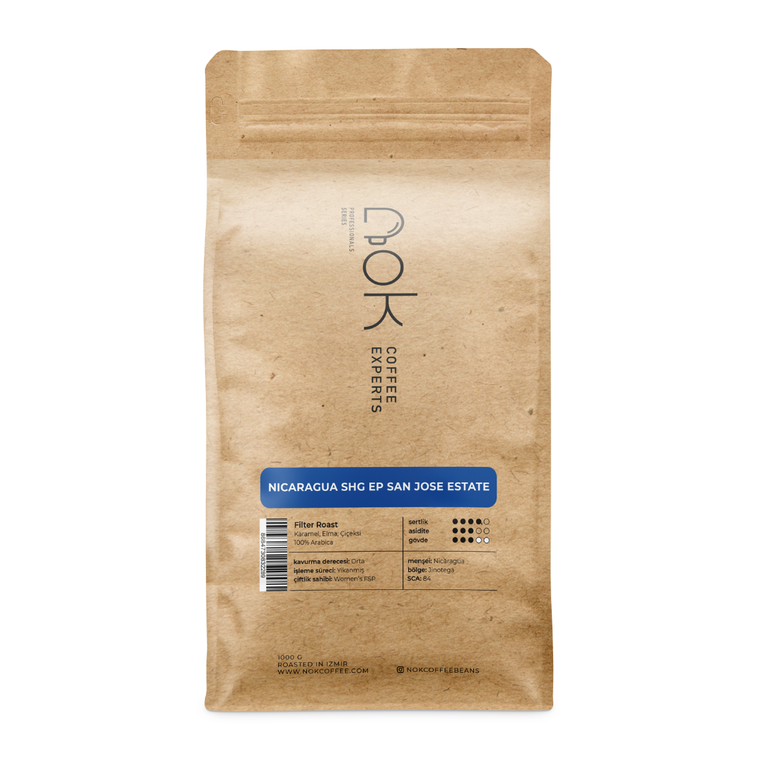 Marka: Nok Coffee Experts Ürün türü: Single Origin 100 % Arabica Nicaragua SHG EP San Jose Estate, Orta Amerika’nın kaliteli kahve üretim bölgelerinden Nicaragua’da, yüksek rakımlı (1.200 – 1.700 m) San Jose Estate çiftliğinde yetiştirilen seçkin Arabica çekirdeklerinden oluşur. “SHG (Strictly High Grown)” ifadesi, kahvenin yüksek rakımlarda yetiştiğini ve bu sayede daha yoğun aroma ve asiditeye sahip olduğunu belirtir. “EP (European Preparation)” ise çekirdeklerin yabancı maddelerden arındırılarak titizlikle seçildiğini gösterir. Yıkanmış (washed) işlem yöntemiyle işlenen San Jose Estate kahvesi, temiz, dengeli ve canlı bir fincan sunar. Karamel, elma ve çiçeksi notalarıyla zengin bir tat profiline sahiptir. Nicaragua SHG EP San Jose Estate, hem filtre kahve hem de espresso hazırlamak için ideal, yüksek kaliteli ve sürdürülebilir üretimle elde edilmiş bir kahvedir.
