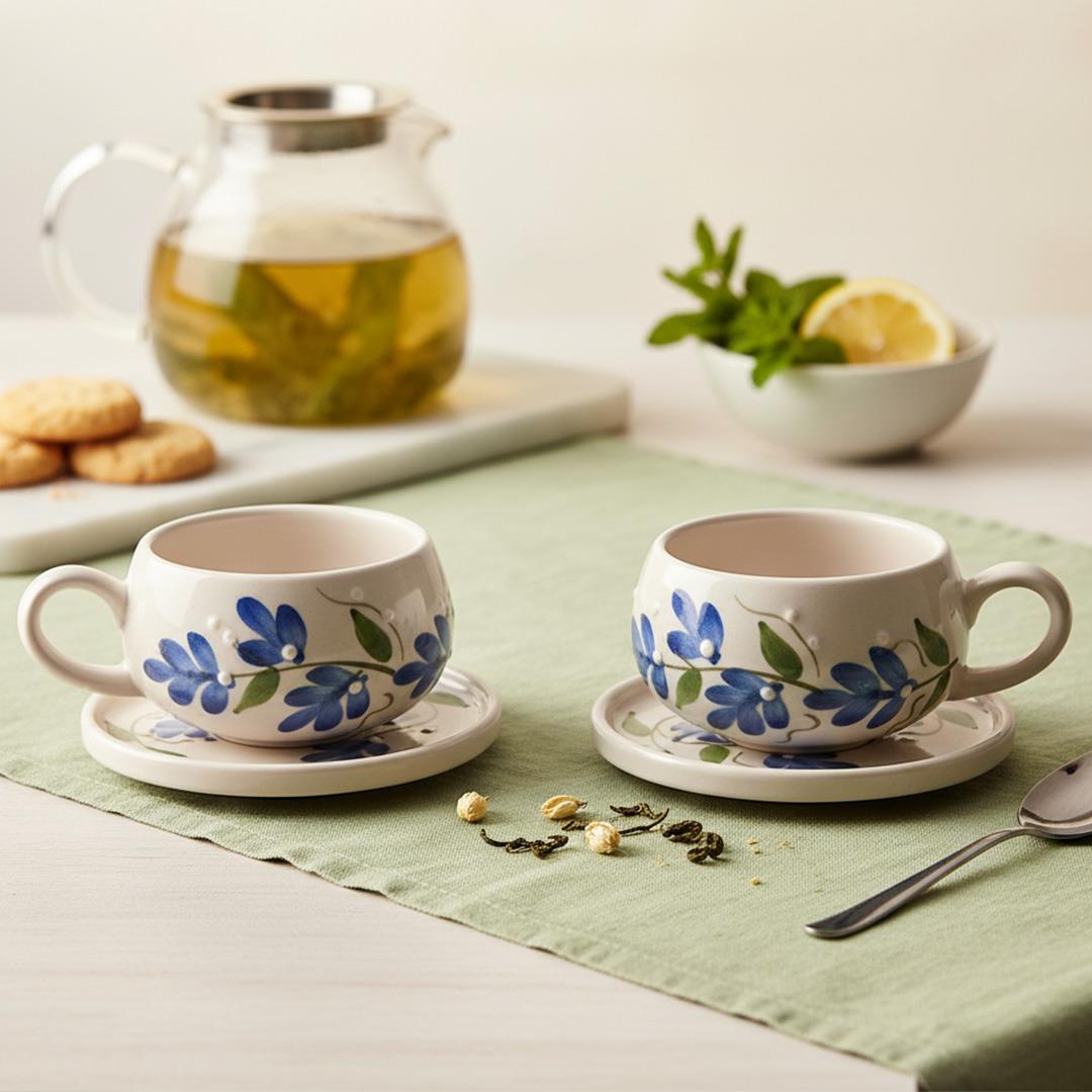 Oze Tabaklı Seramik Fincan 2'li Set – No: 21 Mavi Çiçekli Tasarım