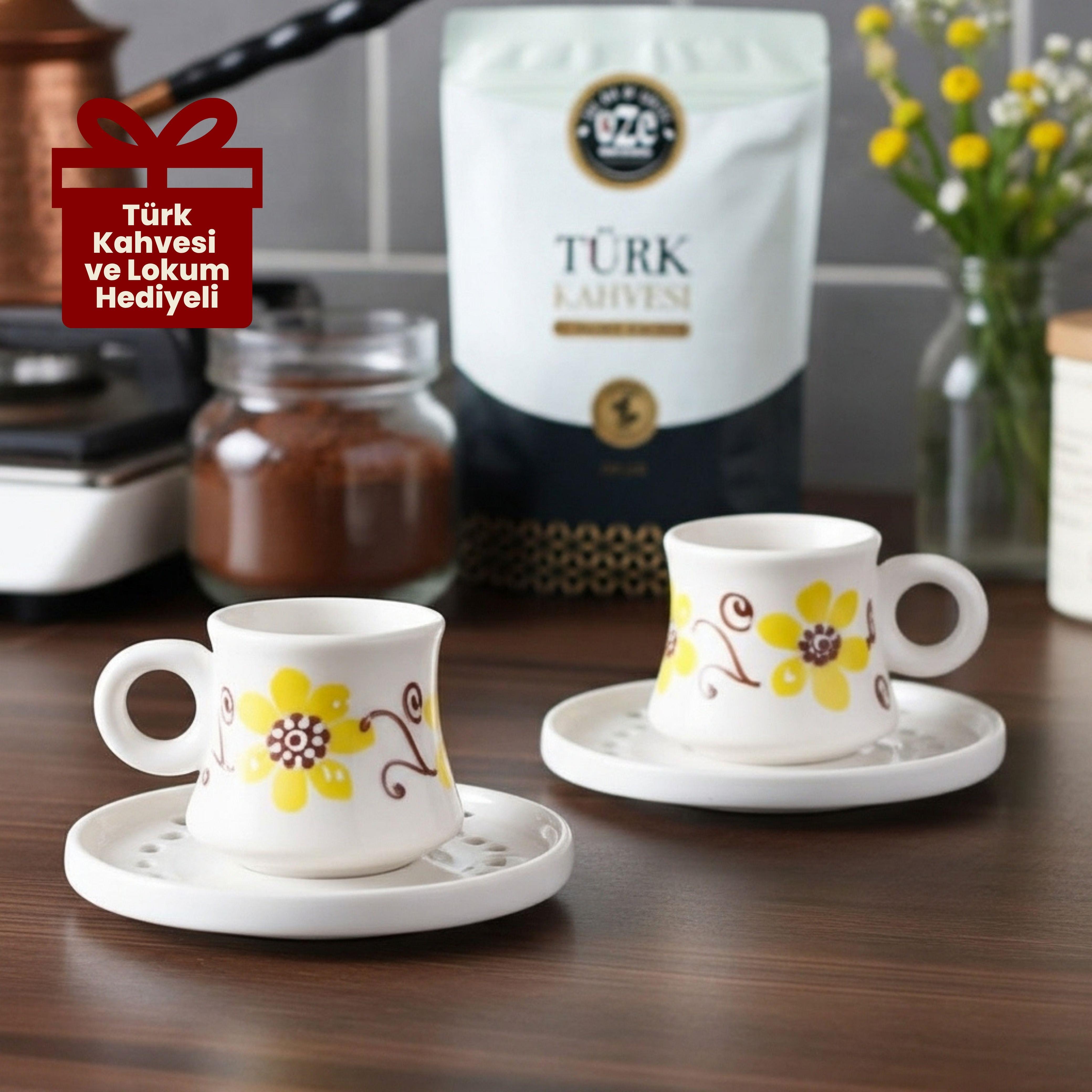 Oze Türk Kahvesi Fincan Seti – No: 04 Sarı Çiçekli Tasarım - 2'li Türk Kahvesi Fincanı, Türk Kahvesi ve Lokum