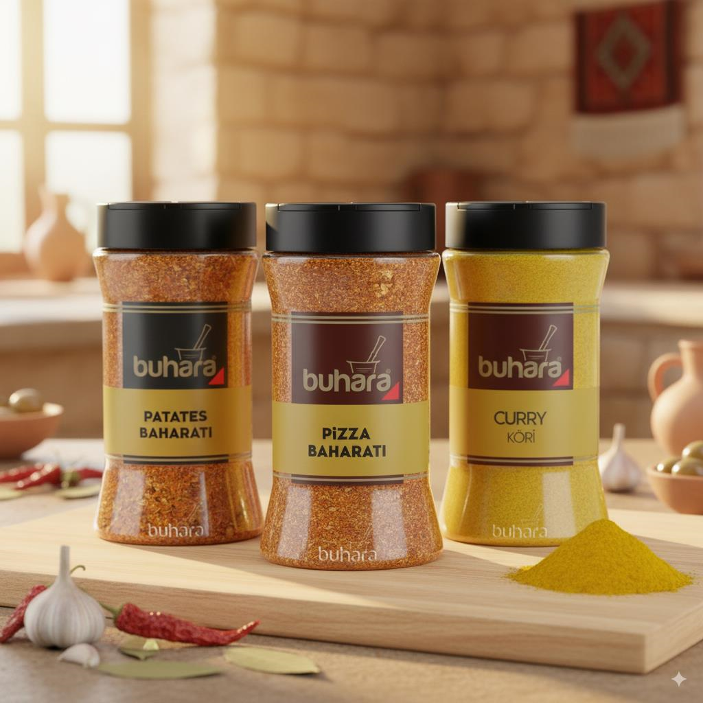 BUHARA MANGAL BAHARATI 3'lü SET 550 GR Buhara Pizza Baharat PET 150GR Buhara Patates Baharat PET 200GR Buhara Köri Baharat PET 150 GR