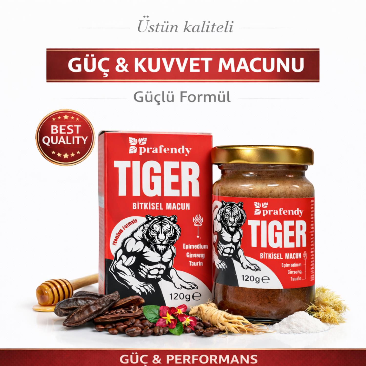 🐅 PRFENDY TIGER – GÜÇ & KUVVET MACUNU Prafendy TIGER Güç & Kuvvet Macunu, bitkisel içeriklerden oluşan özel formülüyle yetişkin bireylerin günlük kullanım alışkanlıklarına uygun olarak hazırlanmıştır. Yoğun kıvamı ve kendine özgü aromasıyla pratik bir tüketim sunar. Yoğun kıvamı ve kendine özgü aroması nedeniyle, tüketim sonrası bir miktar su içilmesi önerilir . Gün içerisinde yeterli miktarda su tüketimine dikkat edilmesi tavsiye edilir. Ürün Adı: TIGER Bitkisel Macun